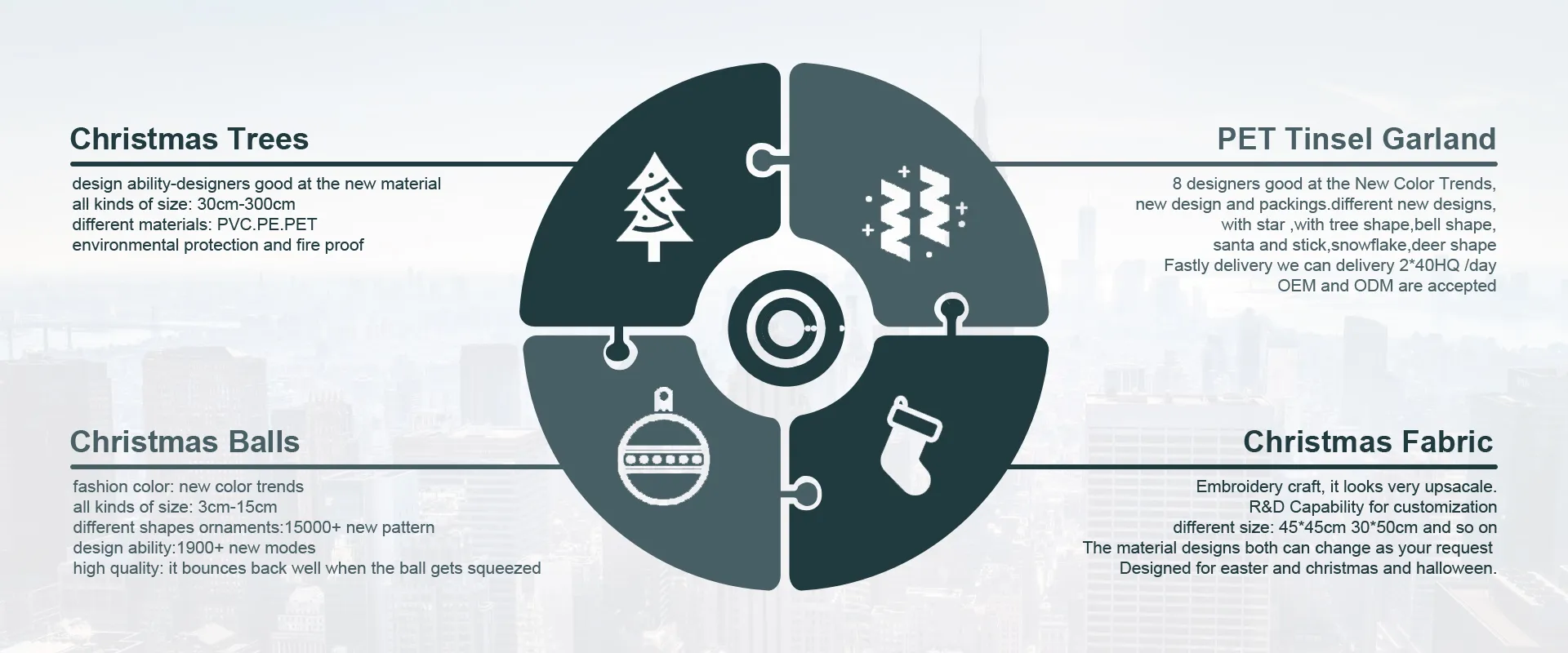 Shuangyuan Group is one of the Biggest Christmas Decoration Factory in China. It was Established in 2006, now have more than 600 employees, the construction area around 100,000 square meters ,The total investment is 500 million yuan. Our factory Located near at The famous small commodity City -Yiwu. No.3 Of YongLe Road.Niansanli Industrial Zone.