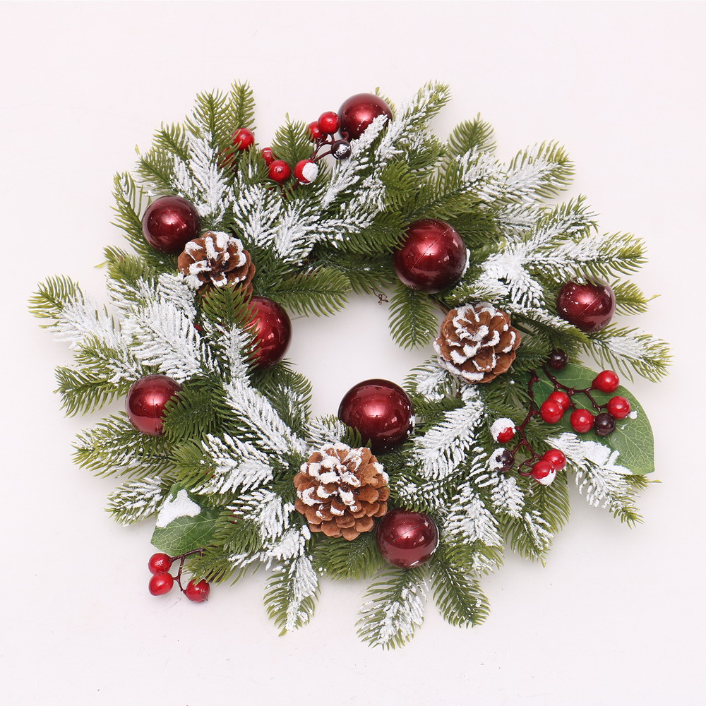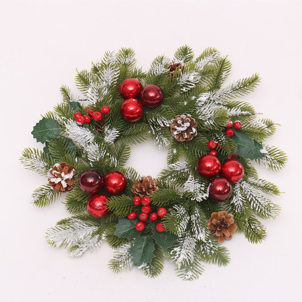 Description | 42*19cm+21tips green PVC wreath,4cm shiny red plain ball*9pcs,4cm pine cone*5pcs,1pc/opp bag |