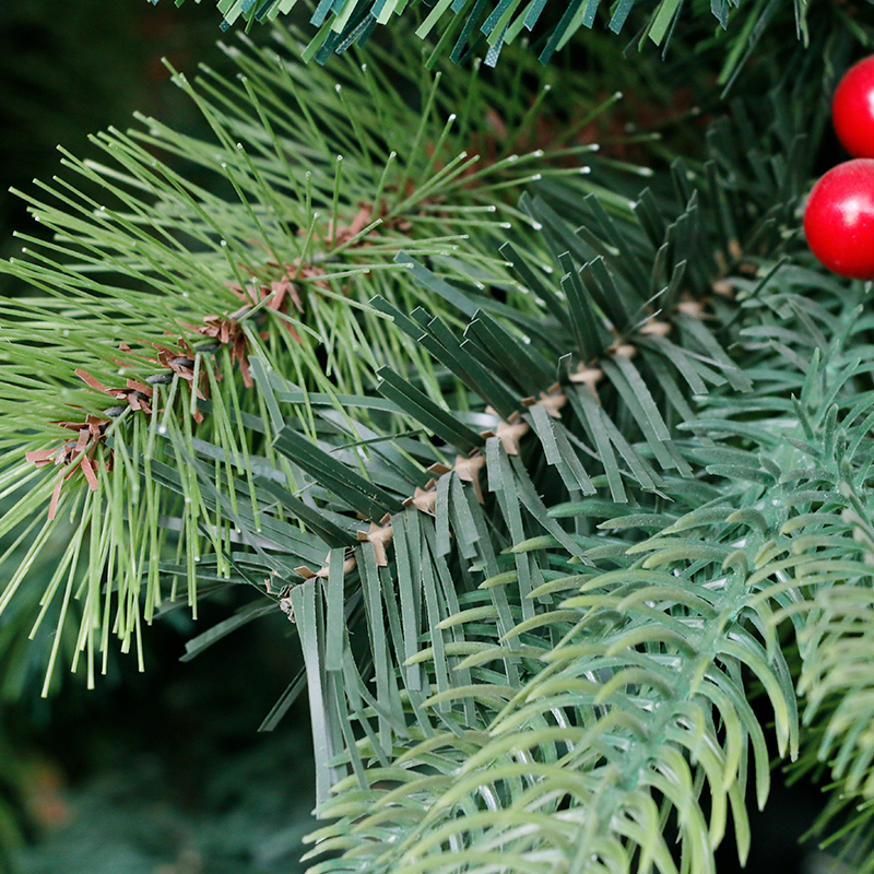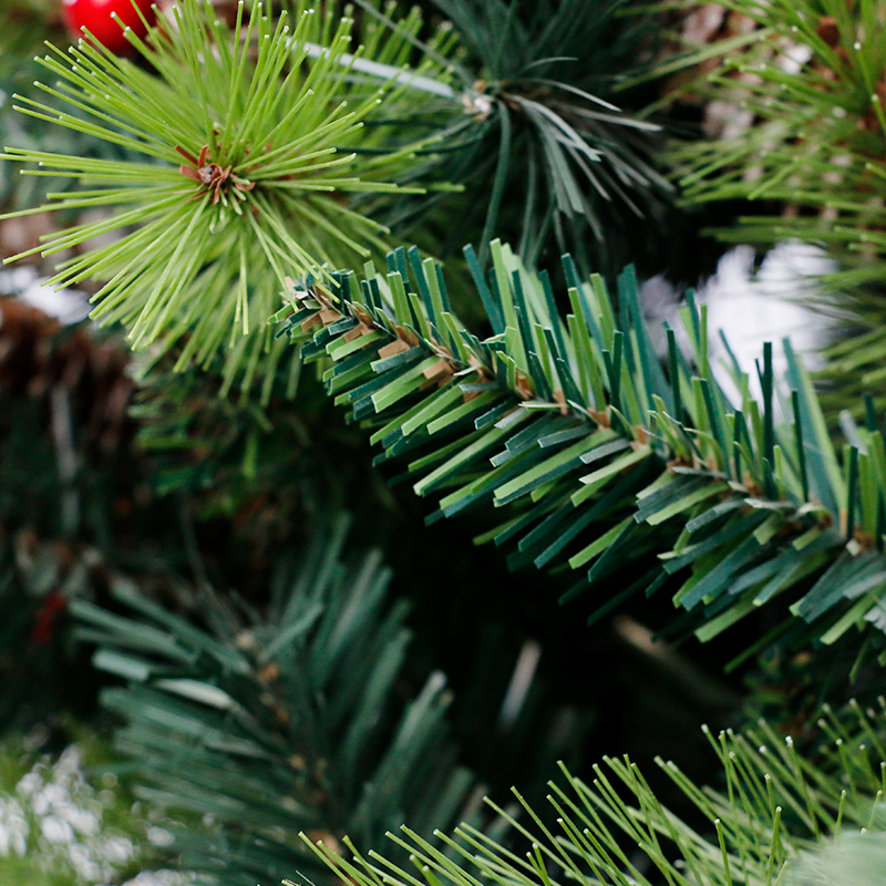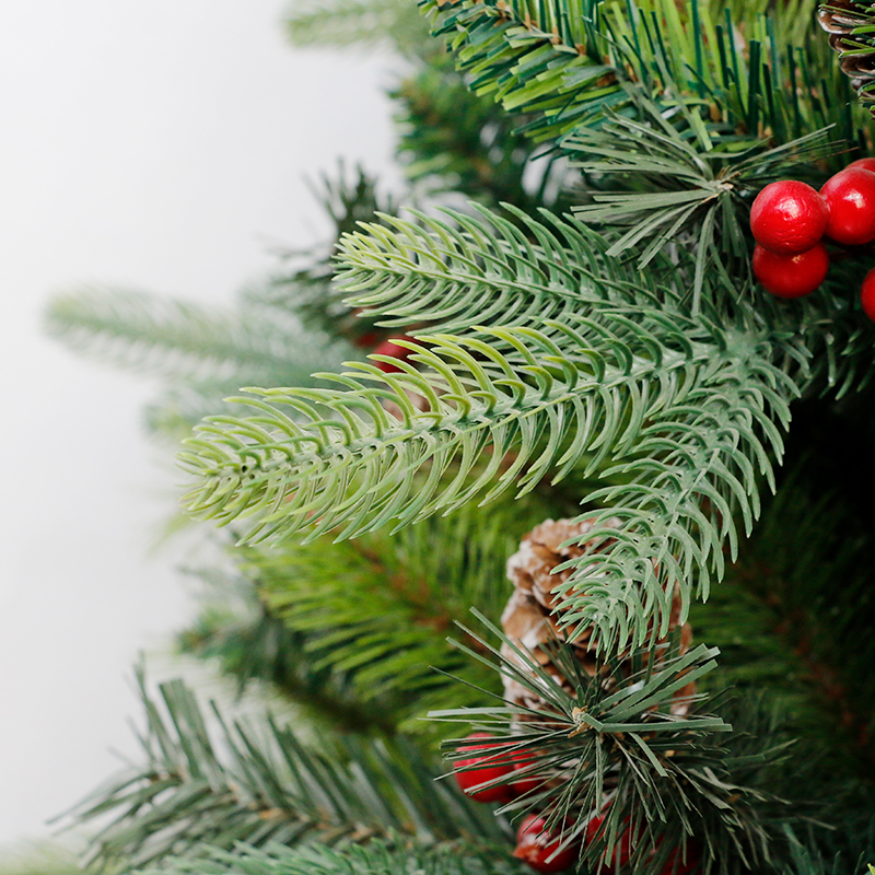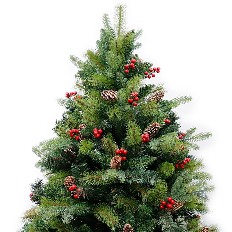 Description | green PE + PVC mixed Christmas tree with pine cones and red berries as photo,hinged struction,leaf specification: 6cm*0.1mm |