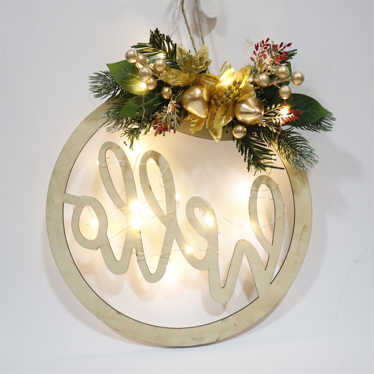 30 CM wooden hanging wreath decoration with light & gold berry gold boll& fabric flower Outdoor Christmas home decoration