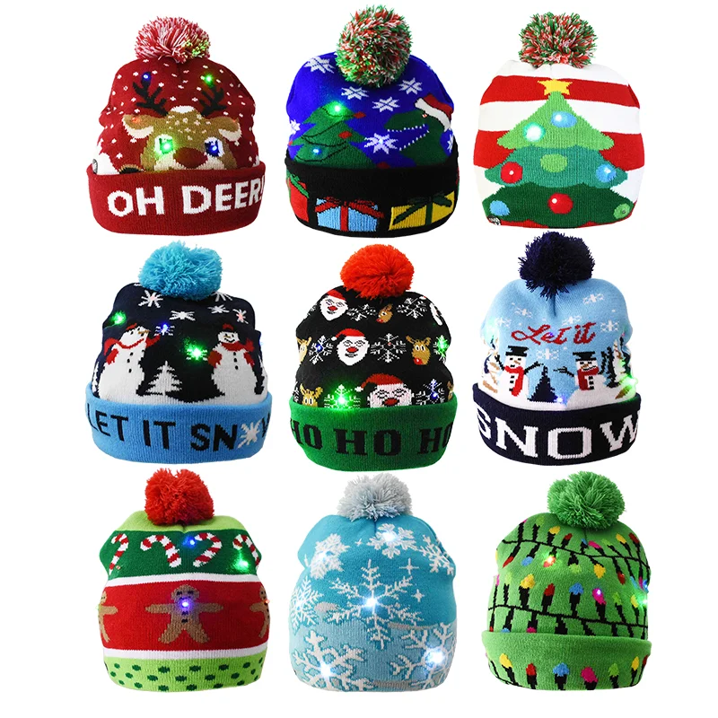 Christmas Hats Sweater Knitted Hat With LED Light Up Cartoon Pattern Kids Christmas Gift Supplies