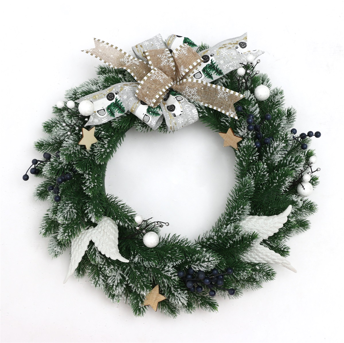 40cm PE Artificial Wreath with bow, blue berry, wing, star and snow effect for Front Door Wall Decorations Learn more