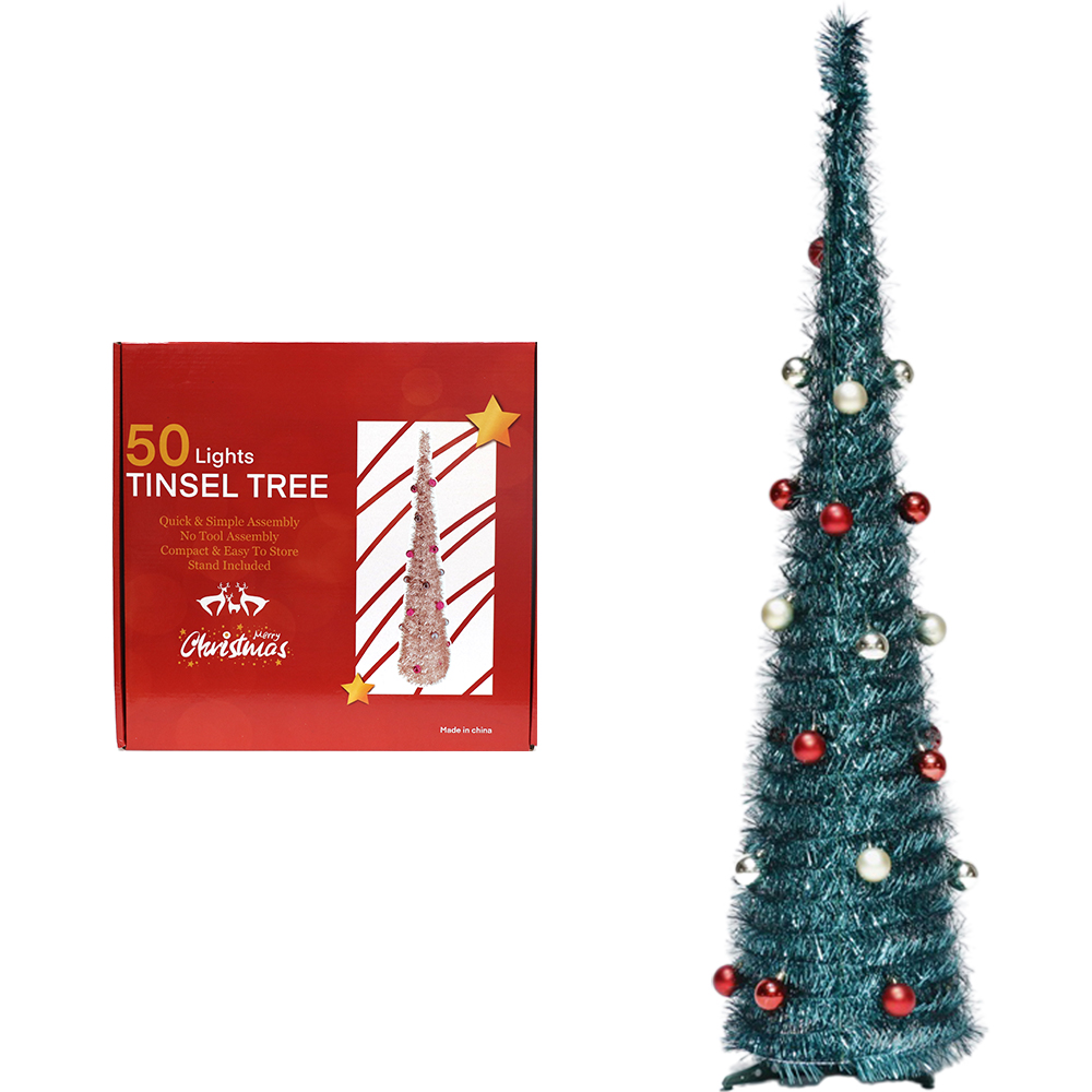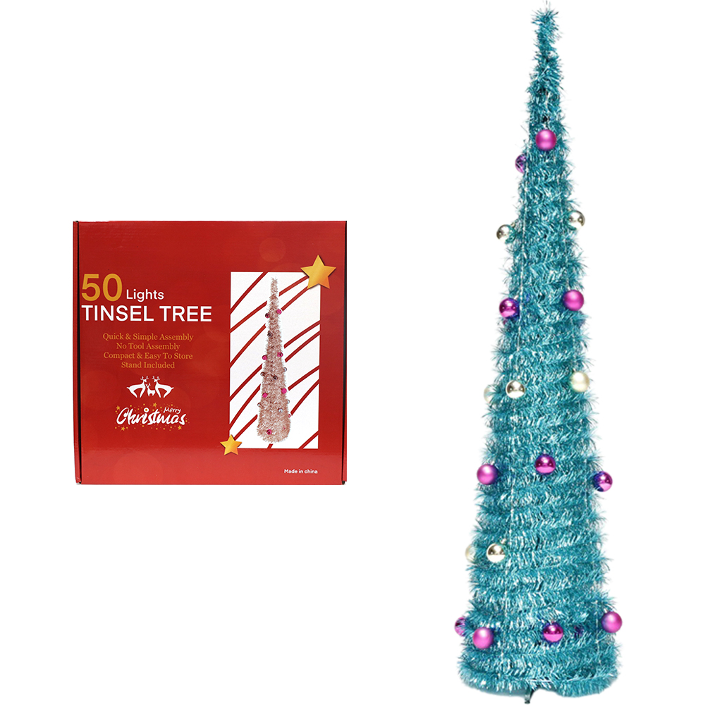 Description | 1.5m blue tinsel folded tree with Christmas ball decoration |