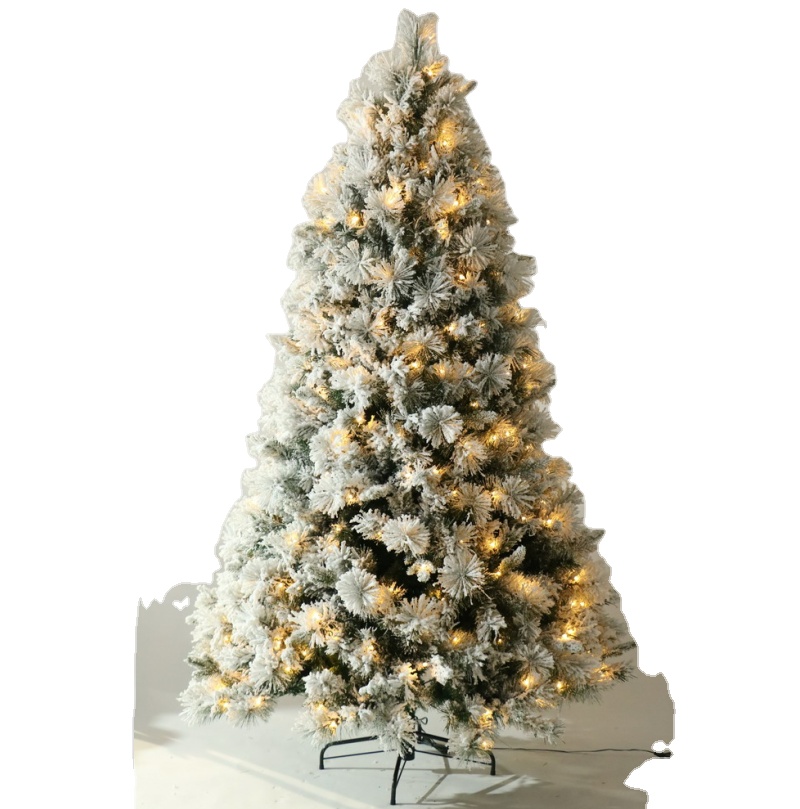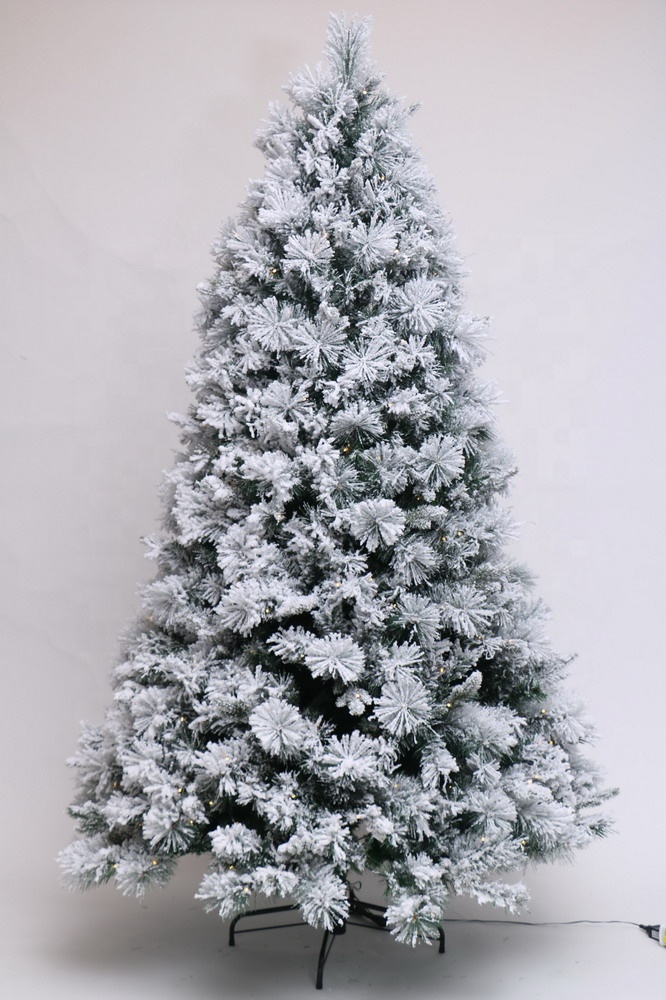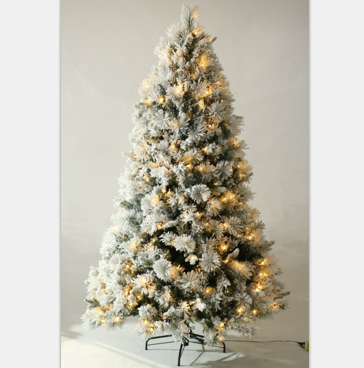 Flocked Artificial Holiday Christmas Pine Tree with LED Lights and Metal Base Stand for Home Office Party Decoration