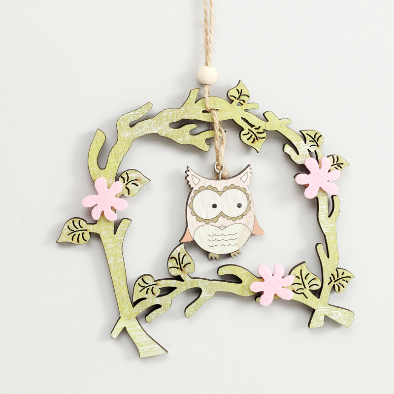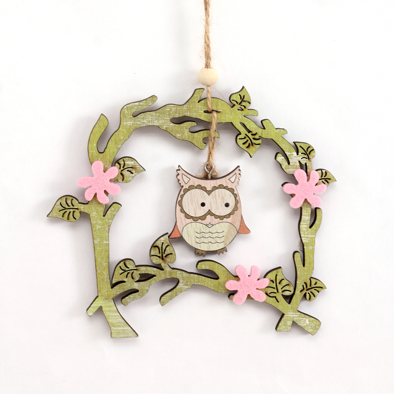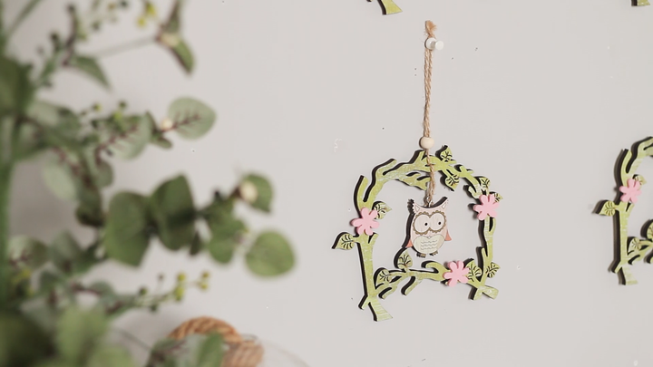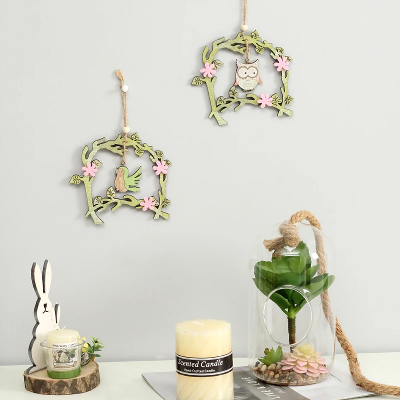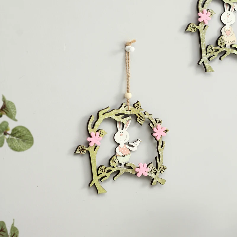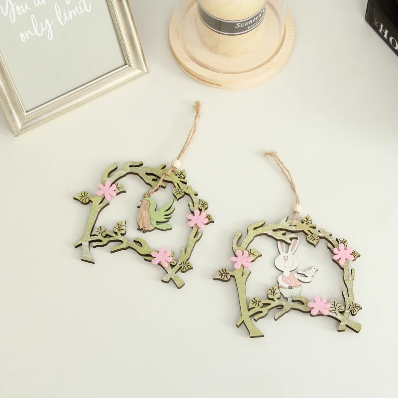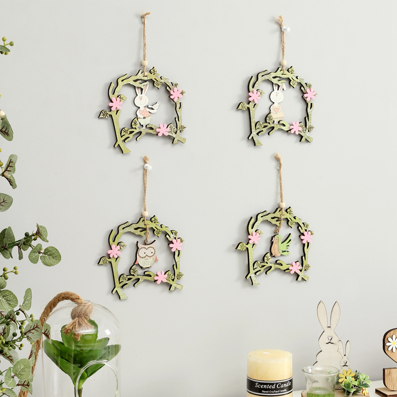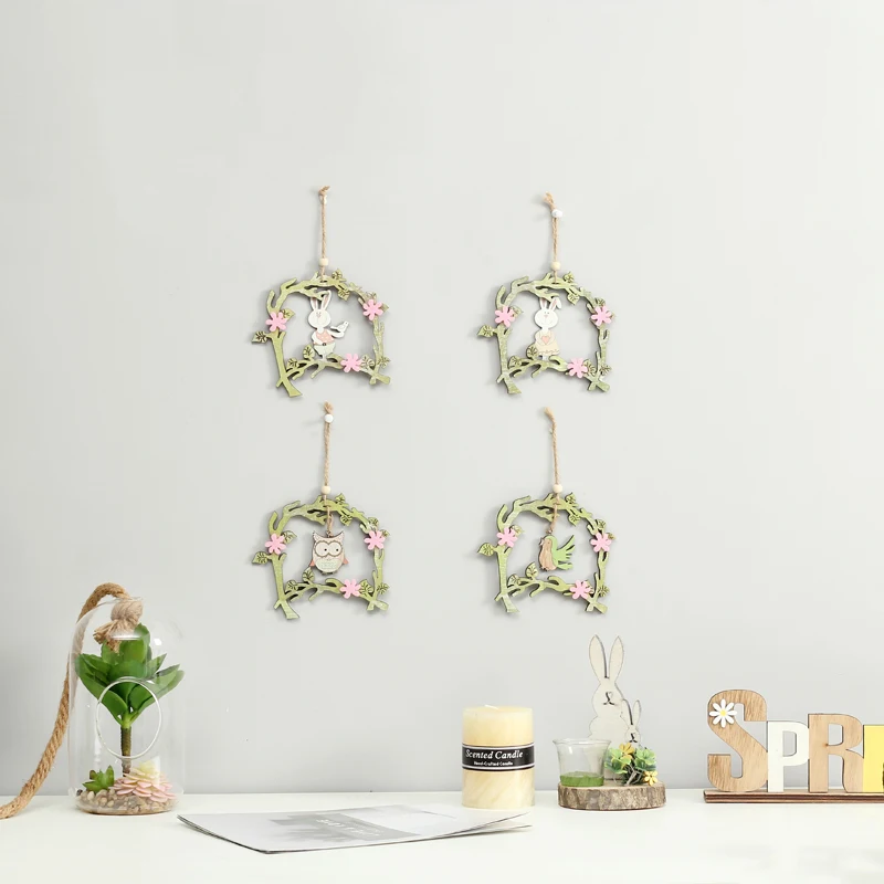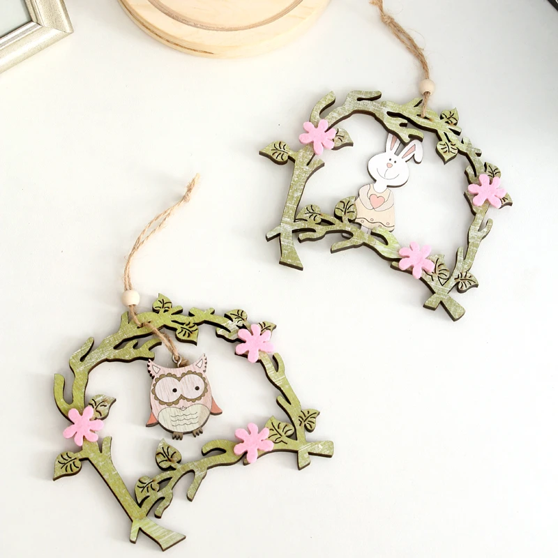 Happy Easter Rabbit Chicken Owl Shape with Flower Rattan Pendant Wooden Hanging Wall Door Decoration Crafts